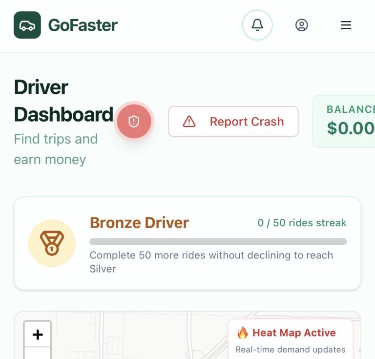 GoFaster features an active, real-time driver dashboard with intelligent heat maps designed to help drivers make smarter decisions and maximize earnings. This technology provides live visibility into high-demand areas, ride volume, and peak activity zones, allowing drivers to position themselves where opportunities are strongest. By giving drivers clear, real-time insights instead of guesswork, GoFaster empowers them with greater control, efficiency, and confidence—creating a more balanced, transparent, and driver-first rideshare experience.
